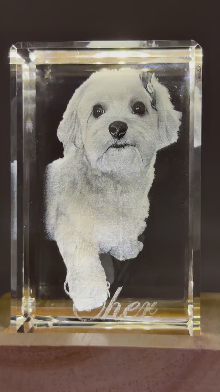Our 3D photo crystal is a stunning personalized keepsake that transforms your favorite images into lasting memories. This custom laser etched crystal captures intricate details with cinematic HD clarity, making it the perfect memory keepsake gift for birthdays, weddings, or pet memorials. Available in two sizes—a small rectangle (40mm x 40mm x 60mm) and a medium size keepsake (50mm x 50mm x 80mm)—this engraved crystal portrait offers a timeless way to celebrate your most cherished moments.