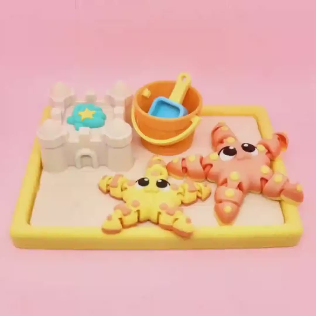 This fun sandcastle playset includes two articulated flexi starfish, a detailed sandcastle, a sand pail with shovel, and a textured sand base. The flexible limbs of the starfish encourage fidgeting and creative positioning, making it an ideal fidget desk toy or office novelty gift that adds cute office decor to any workspace. Each piece is carefully 3D printed, giving it charming surface variations that highlight the handcrafted quality.